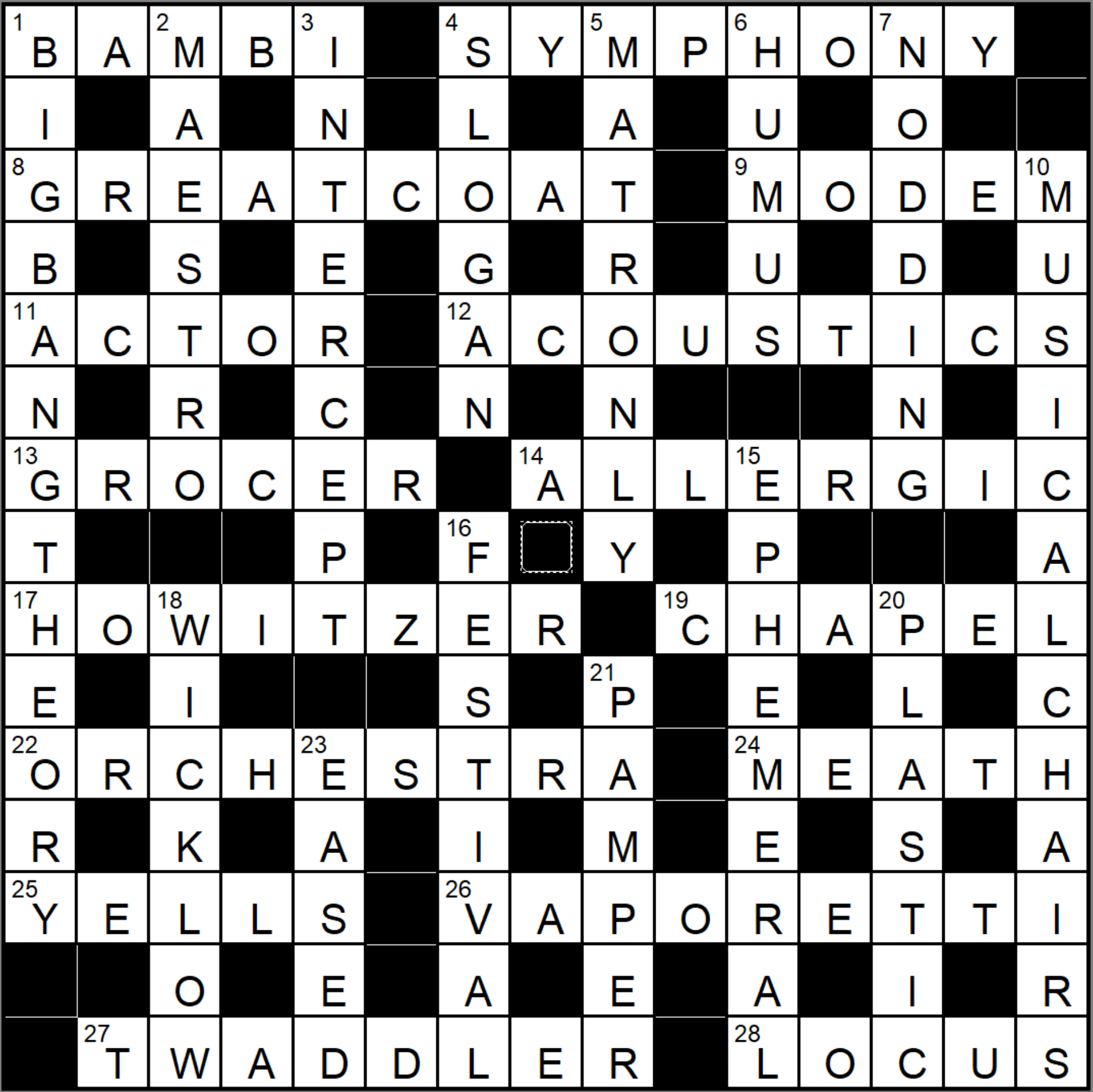 There are a couple of Irish counties in the grid (WICKLOW and MEATH), a few entries relating to music (SYMPHONY, ORCHESTRA, MAESTRO and MUSICAL CHAIRS)and a couple of items associated with World War 1 (GREATCOAT and HOWITZER), but I don’t think there is a theme.