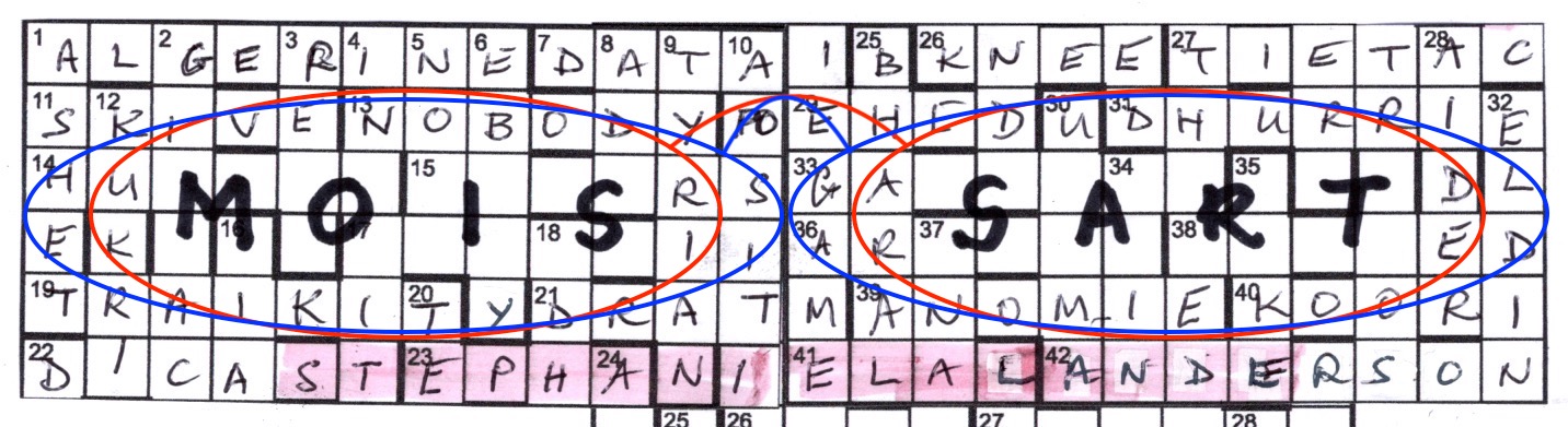 So – after a stiff drink and some annoying letter and cell counting, which always goes wrong for us, the grid was duly filled in and cut up to reveal Napoleon’s spectacles, with POE as the nose-bar, perceiving that awful truth that his bride was Mme Moissart. It took a bit of head-scratching to decide on the M, but the logic of showing the revelation seems clear. A trickier potential ambiguity was that we could see two possible paths for the ovals: we preferred the red one as looking more like specs usually do, but both seem to meet the requirements.
