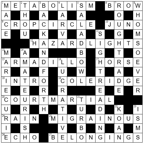 Thanks Imogen for an enjoyable crossword and mc_rapper67 for the blog – great story. I couldn’t account for the U in LUCRATIVE and didn’t understand the letter on the radio – thanks for the explanations. My favourites were JUNO, ARMADILLO and MARIE CURIE (I tried to figure out whether she had anything to do with arsenic – apparently not). I raised eyebrows over “two”in HAZARD LIGHTS – there’s definitely more; the driver behind only sees two though