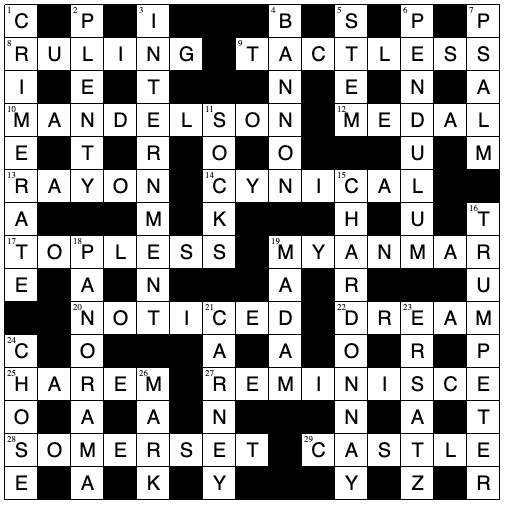 Nothing really held me up except LOI SOMERSET, largely because I misread ‘county’ in the clue as ‘country’. Definitely due to the small font.