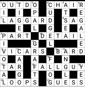 I’m trying the QCs now without looking at the clue type hints for an extra bit of spice, and I thought this week’s was quite challenging and would have been impenetrable 2 years ago. I think new beginners may have found this a struggle as their first quick cryptic. But very fair clueing from Chandler. My favourite was CUDGEL and also my LOI, with LAGGARD not far behind. I agree with Shanne that LAGGARD would not have been out of place in a top end Quiptic or weekday Cryptic. Thanks Shanne for your blog and Chandler for the Saturday challenge.