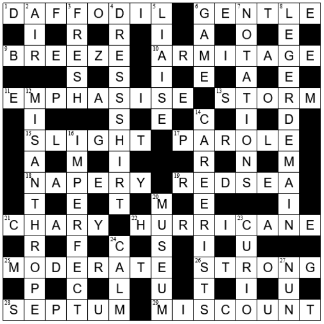 I thought this was a well set Quiptic. The top half flowed out nicely but then I had some hold ups in the bottom half. LEGERDEMAIN and HURRICANE were my favourites and MODERATE my LOI.