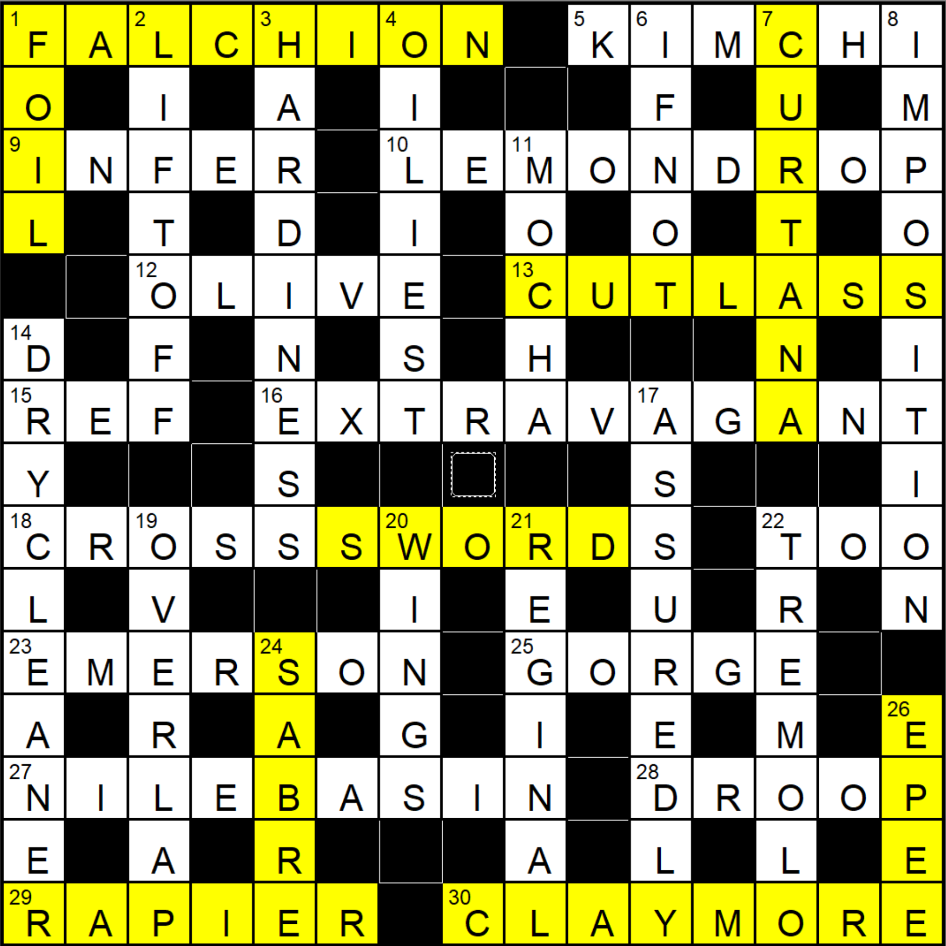 Tuesday is theme day in the Independent cryptic puzzle series. Today’s theme is quite clear. I counted nine SWORDS in the grid as highlighted in the graphic below. Some of them I knew, but FALCHION and CURTANA were new to me.