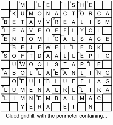 Overall I would say this was not the most taxing of EV solves, with some relatively gentle clueing – notwithstanding a few (to me) ‘obscurities’, as mentioned above – and a generous proportion of crossers on the perimeter, as well as the phrase of unchecked letters. But it was certainly enjoyable, and educational in adding a few names to my personal reference list of ABCs.