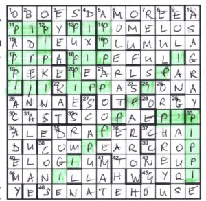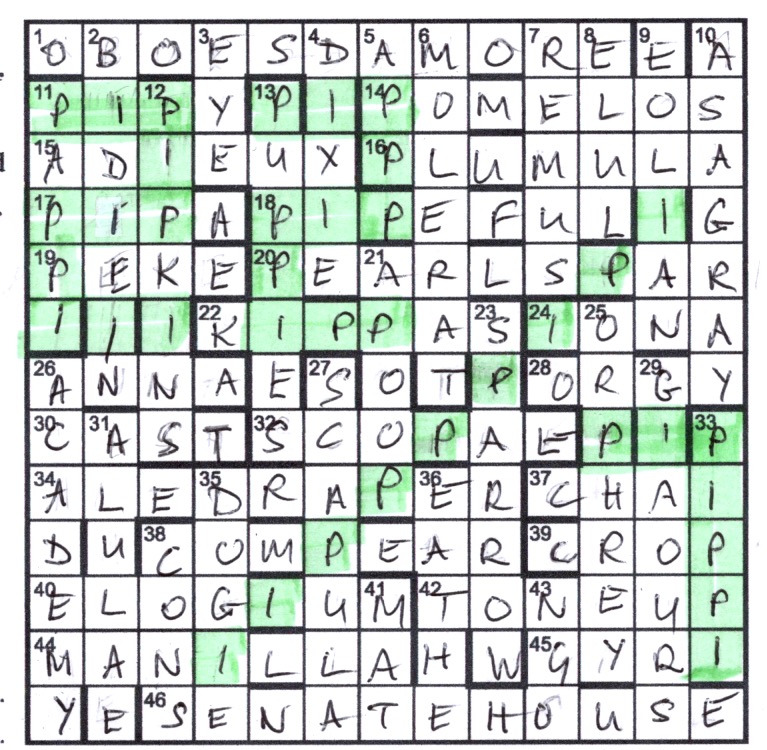 Eventually the full message emerges as SHADE CHARACTERS SUGGESTED BY TITLE AND CLUE WORDLENGTHS. We’re not much the wiser. The shading is presumably in the grid, so we stare at it – and see the very large number of Ps and Is. We do a trial shading of just those and lo and behold 22/7 appears. Pi!