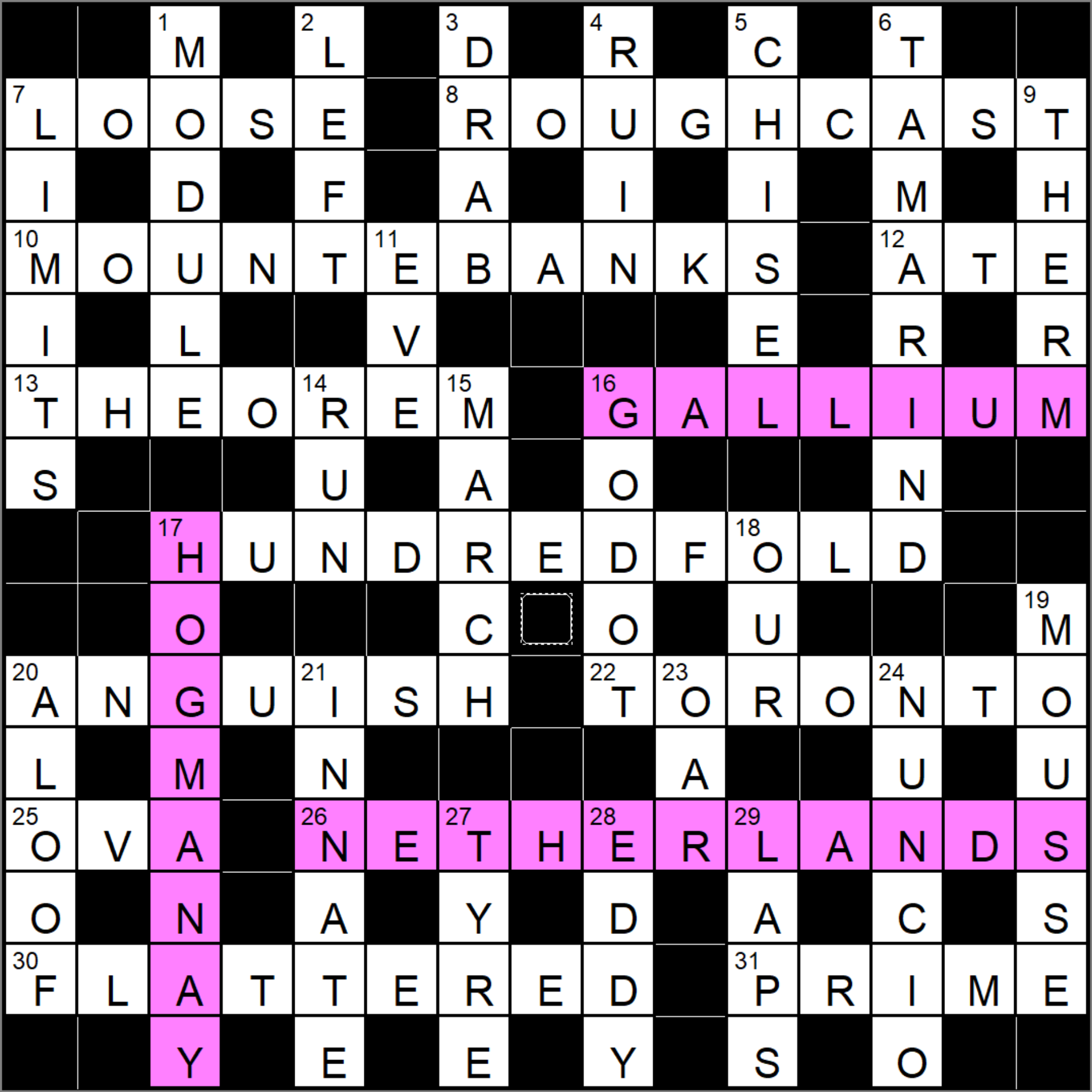 The three unclued entries were GALLIUM (an element with atomic number 31), NETHERLANDS (the International Calling Code number for The Netherlands is +31, and HOGMANAY (Scottish name for New Year’s Eve, 31st December).