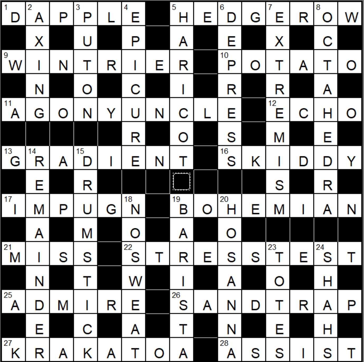 As usual, there were some splendid clues today. In the acrosses, I liked the one for HEDGEROW with its pastoral and ecological references, the one for GRADIENT for the surface and the one for KRAKATOA for its geographical misdirection. In the downs, the standout clue for me was the one for AXING, especially as Ange Postecoglou has had a few sackings himself in recent months. I also liked the definition of ‘serving ace’ for BARISTA.
