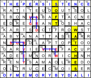 A little more searching, and I came across SOFT WATCHES “gentle observations” – apparently another alternative name given to the work – there in the grid after changing 16a’s I to F and 31a’s G to T.