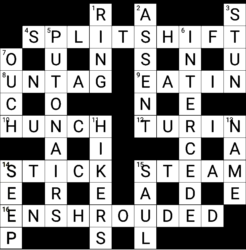 Didn’t finish. Was this a “quick” cryptic? SPLIT SHIFT eluded me — both the definition and the wordplay.
