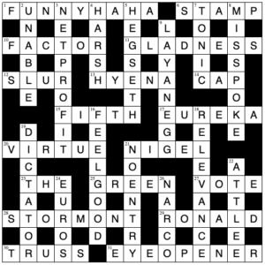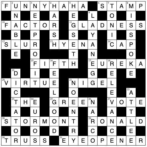 FUNNY (rich, as in “that’s rich”) + HAHA (country landscape feature that isn’t) – in the sense of those sunken deer walls sometimes seen at stately homes, to keep the undesirable ungulates out without spoiling the view from the house. As usual, the rest of the puzzle features several people who are more ‘funny oo-er’. |