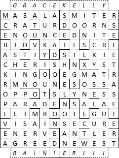 An excellent, well-conceived, well-constructed and well-clued Inquisitor. I found the Down clues generally a tad harder to solve than the Acrosses. I came to a stop with just 38 ALAE to solve, leaving a gap in the collected ‘extra’ letters with ‘Q’ to follow it – a ‘problem’ very similar to that noted by the blogger! That pair of letters surely had to be HQ or IQ, and it took me also longer than it should have to see the meaning of ‘IQ NUMBER’. Given GRACE KELLY and RAINIER III (arising from the Down clues), PRINCESS OF MONACO was an obvious guess at the new ‘title’, and I decided simply to try the three pairs of symmetrically placed eight-letter words in turn to see which of them would accommodate the change, incidentally forgetting that there were a few non-words to resolve in the grid. It turned out to be the first such pair I tried (ENOUNCED/INSECURE) – a very satisfying outcome.