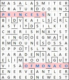 Current entries at 2d, 3d, 4d, 5d & 7d up top, and 36d, 37d & 34d down below weren’t real words so the entries to change had to fix that which meant we were targeting 13a and the symmetric 43a. A quick check and sure enough PRINCESS OF MONACO was the change of title that did the trick.