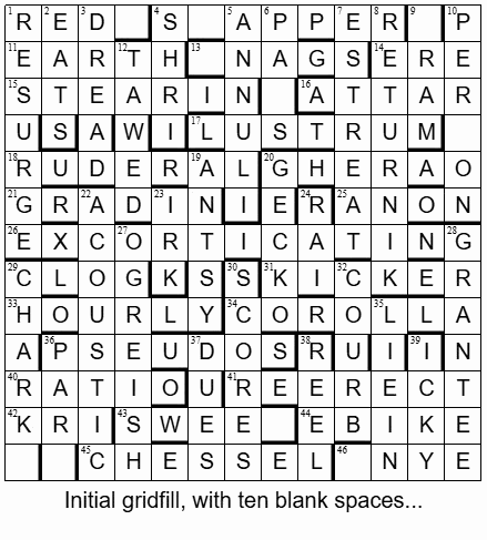 And so it continued – with a few likely one-short entries – PAR, RAM, NYE – and a few interesting/new (to me) words, like EXCORTICATING, CHARK, RUDERAL and CHESSEL. Luckily I knew GHERAO, from time spent travelling around India in the early 90s and reading the news – GHERAO, CRORE, LAKH, LATHI and many more all embedded in my lexicon.