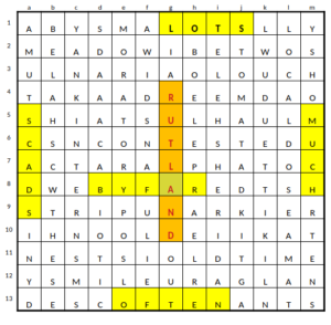 OK, grid filled. What next? I’ve had a lot of trouble with endgames recently and I thought, “oh, here we go again. I’m going to have to ask for help.” As ever, elmac came to my rescue as she discovered that MULTUM IN PARVO (much in little) is also the motto of Rutland. That explains why/where these words are “locally significant” and there we find RUTLAND in the central column from g4-g10.